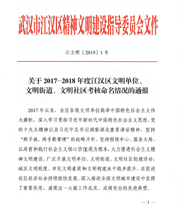 日前,中共武漢市委、武漢市人民政府命名表彰2017—2018年度市級文明單位、文明街道(鄉(xiāng)鎮(zhèn))、文明社區(qū)(村),集團公司獲評“2017—2018年度市級文明單位”。同時,集團公司還被江漢區(qū)精神文明建設(shè)指導委員會命名為 “2017—2018年度區(qū)級最佳文明單位”。