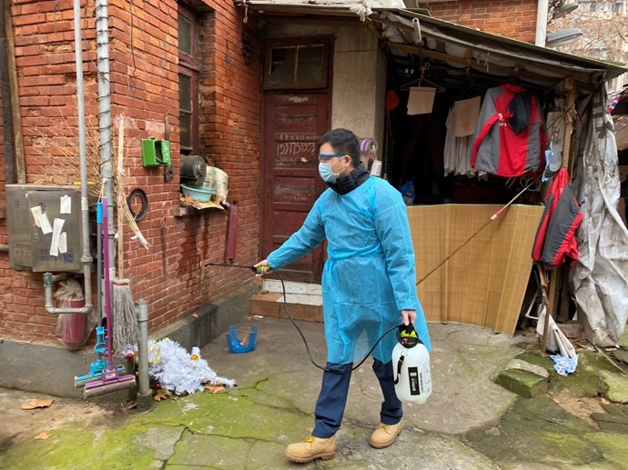 硚口區韓家墩街和江漢區北湖街的社區確診病例和發熱門棟較多,日常防護和社區清理消毒工作任務重大。突擊隊員們勇于擔當作為,佩戴金控集團突擊隊袖章,按照街道社區安排,積極開展門口執勤、檢測體溫、消毒防護、幫扶老人、運輸物資等工作。