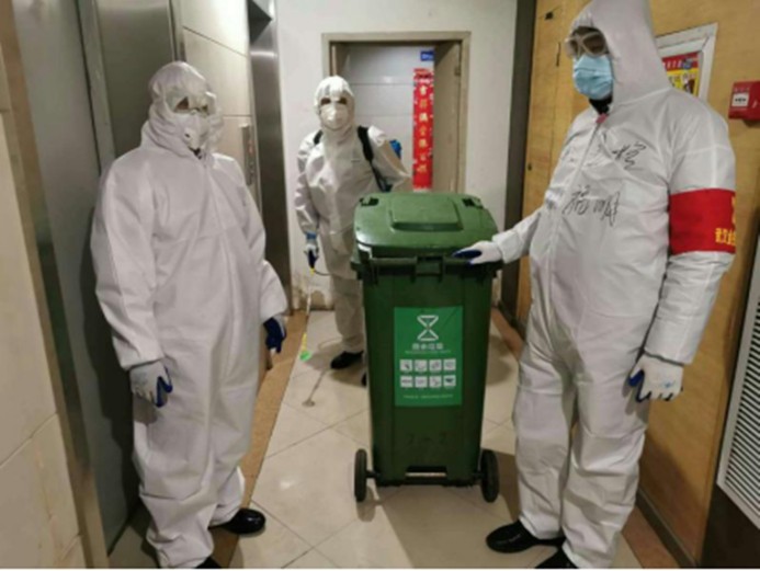 2月20日,集團機關突擊隊第八組接到八古墩社區的緊急工作任務,社區所轄頂琇晶城小區有兩戶確診新型冠狀病毒肺炎病人的衣服、床、棉被及生活物品需清理消毒。突擊隊第八組組長、共產黨員甘李彪,突擊隊員謝福明、盧學軍面對病毒危險,毫不畏懼,聞令而動,堅決服從社區指揮,在做好個人防護的前提下,協同社區工作人員先將患者丟棄物品集中進行初步消毒,然后將患者棄物打包裝入垃圾桶,最大限度的減少患者物品攜帶病毒擴散到電梯等公共場所,切斷疫情傳播源。