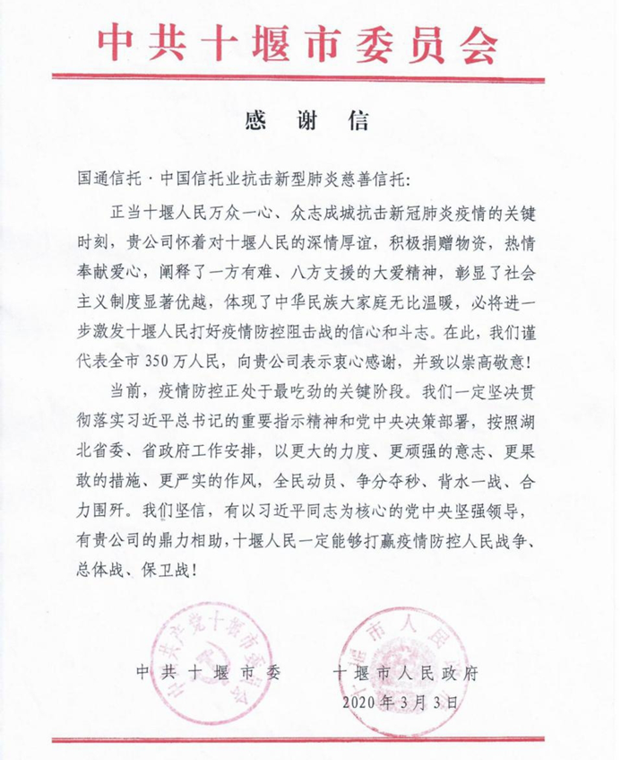 “你們積極捐贈物資,熱情奉獻愛心,闡釋了一方有難、八方支援的大愛精神,向你們致以崇高敬意。”3月15日,國通信托·中國信托業抗擊新冠肺炎專項慈善信托收到十堰市委市政府發來的感謝信。該慈善信托近日向十堰市鄉鎮衛生院捐贈7輛總價值143.5萬元的愛心救護車,已用于開展疫情防控及醫療衛生工作。