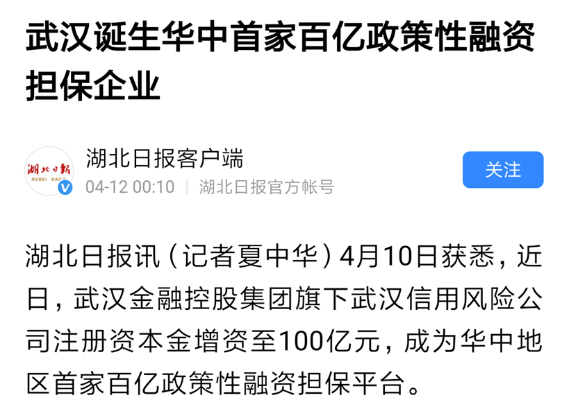 4月10日獲悉,近日,武漢金融控股集團(tuán)旗下武漢信用風(fēng)險(xiǎn)公司注冊(cè)資本金增資至100億元,成為華中地區(qū)首家百億政策性融資擔(dān)保平臺(tái)。