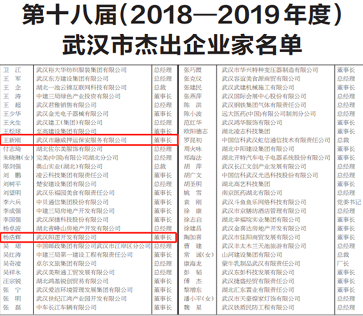 12月15日,武漢企業(yè)聯(lián)合會(huì)、武漢企業(yè)家協(xié)會(huì)發(fā)布第十八屆(2018-2019年度)武漢優(yōu)秀企業(yè)和優(yōu)秀企業(yè)家榜單,集團(tuán)公司、武漢金交所、陽(yáng)開(kāi)公司榮獲“武漢市優(yōu)秀企業(yè)”稱號(hào),集團(tuán)總經(jīng)理梅林榮獲“武漢市卓越企業(yè)家”稱號(hào),集團(tuán)總經(jīng)理助理、融威押運(yùn)公司董事長(zhǎng)王新剛,陽(yáng)開(kāi)公司董事長(zhǎng)楊浩輝榮獲“武漢市杰出企業(yè)家”稱號(hào)。