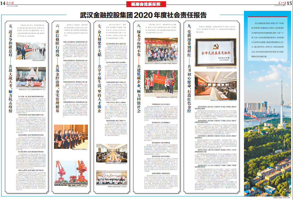 武漢金融控股(集團)有限公司(下稱集團)積極踐行金融國企社會責任,堅決貫徹落實市委市政府各項戰略部署,服務“六保”“六穩”任務,在加快高質量發展同時,自覺把履行社會責任全面融入集團發展戰略和企業文化,通過多種形式、多種方式、多條戰線回饋社會,成為支持區域實體經濟發展、助力疫后重振的堅實金融力量。