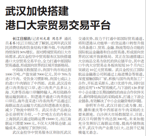 長江日報記者了解到,近兩年武漢居民消費結(jié)構(gòu)和飲食結(jié)構(gòu)不斷升級,牛肉消費持續(xù)保持30%增長。面對跨境貿(mào)易的巨大市場需求,武漢金控華中貿(mào)易服務(wù)區(qū)加快搭建港口大宗貿(mào)易交易平臺,全力打通中部國際貿(mào)易通道,形成面向世界的區(qū)域開放新格局。