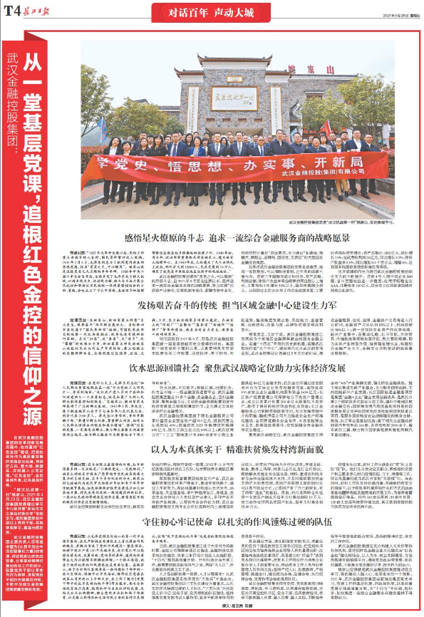 姚家山黨課就是武漢金融控股集團推動黨史學習、黨的建設入腦入心、走深走實的一個縮影。2021年,武漢金融控股集團全面推動集團黨史學習、黨建工作向基層拓展,向縱深拓展,以高質量黨建引領高質量發展,為“十四五”開好局、起好步,加快集團一流綜合金融服務商建設提供不竭思想動力。