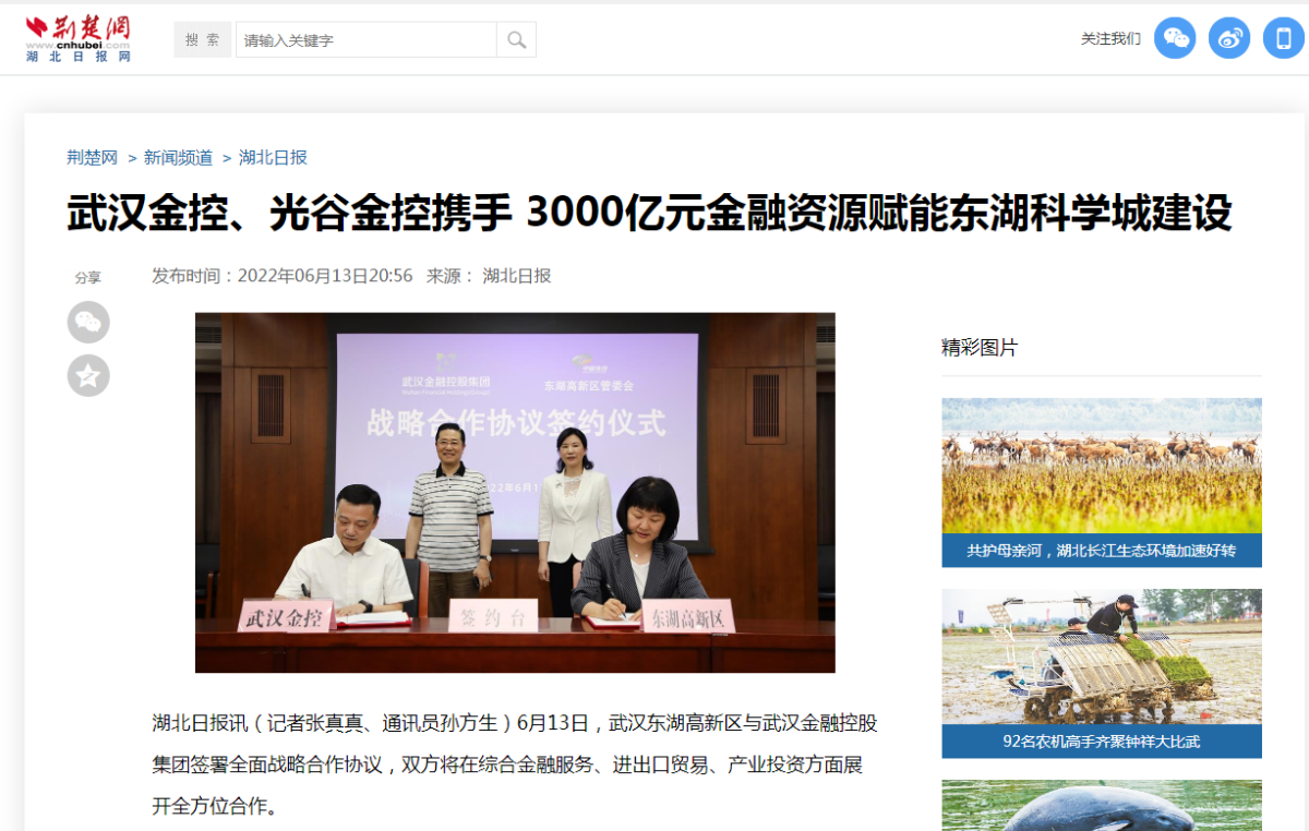 6月13日,武漢東湖高新區與武漢金融控股集團簽署全面戰略合作協議,雙方將在綜合金融服務、進出口貿易、產業投資方面展開全方位合作。