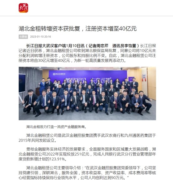 長江日報記者近日獲悉,湖北金融租賃公司收到湖北銀保監局批復,同意公司將10億元未分配利潤轉增注冊資本,公司股東和持股比例不變。自此,湖北金融租賃公司注冊資本將由30億元增至40億元,為新一輪高質量發展再添動力。