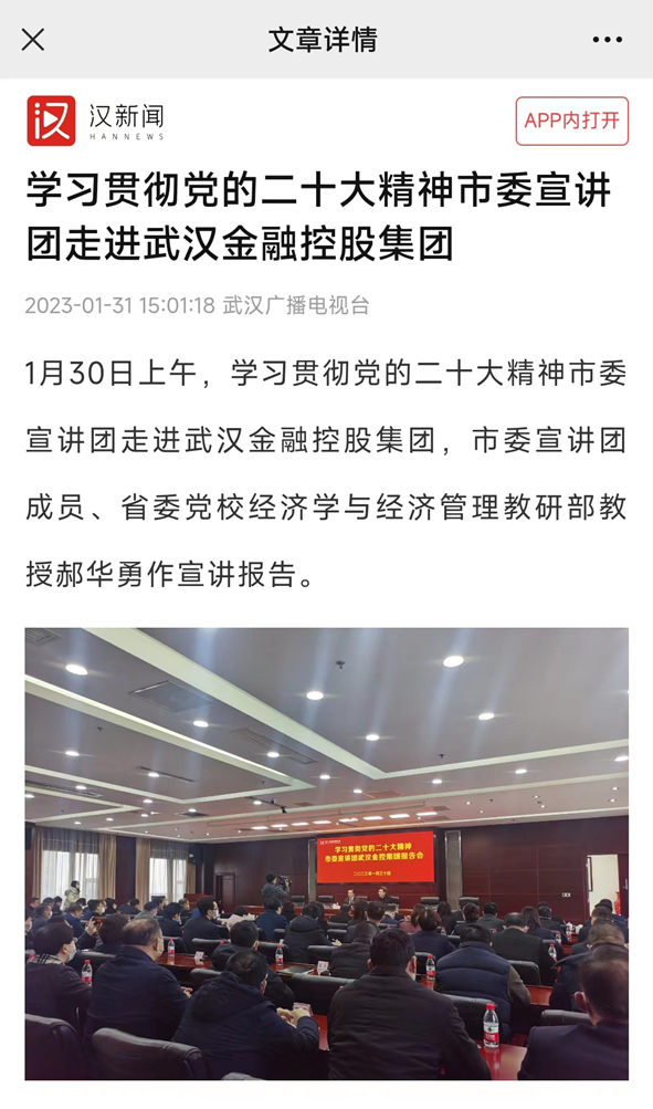 1月30日上午,學習貫徹黨的二十大精神市委宣講團走進武漢金融控股集團,市委宣講團成員、省委黨校經濟學與經濟管理教研部教授郝華勇作宣講報告。