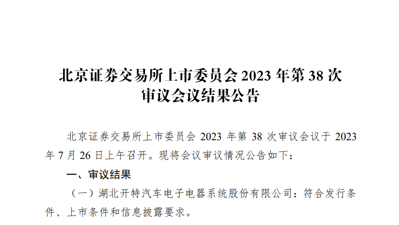 7月26日,北京證券交易所上市委員會召開2023年第38次審議會議,集團旗下九州證券獨家保薦的湖北開特汽車電子電器系統股份有限公司IPO申請獲通過。