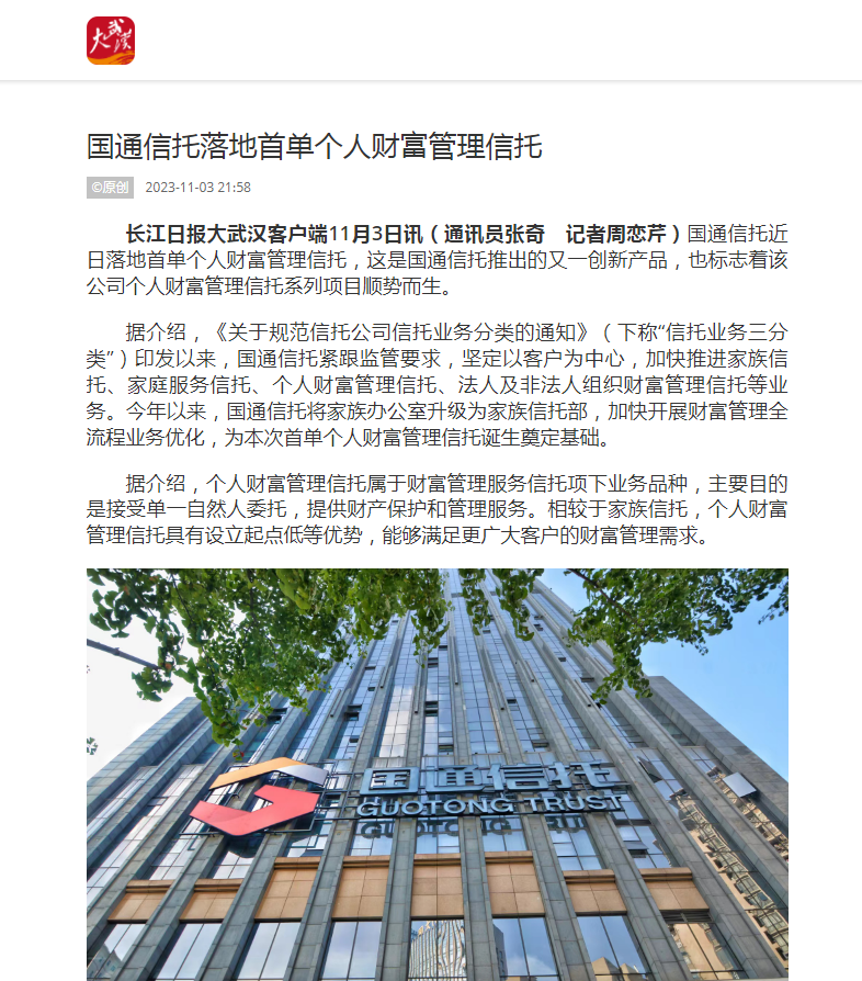 據(jù)介紹,《關(guān)于規(guī)范信托公司信托業(yè)務(wù)分類的通知》(下稱“信托業(yè)務(wù)三分類”)印發(fā)以來,國通信托緊跟監(jiān)管要求,堅(jiān)定以客戶為中心,加快推進(jìn)家族信托、家庭服務(wù)信托、個人財(cái)富管理信托、法人及非法人組織財(cái)富管理信托等業(yè)務(wù)。今年以來,國通信托將家族辦公室升級為家族信托部,加快開展財(cái)富管理全流程業(yè)務(wù)優(yōu)化,為本次首單個人財(cái)富管理信托誕生奠定基礎(chǔ)。