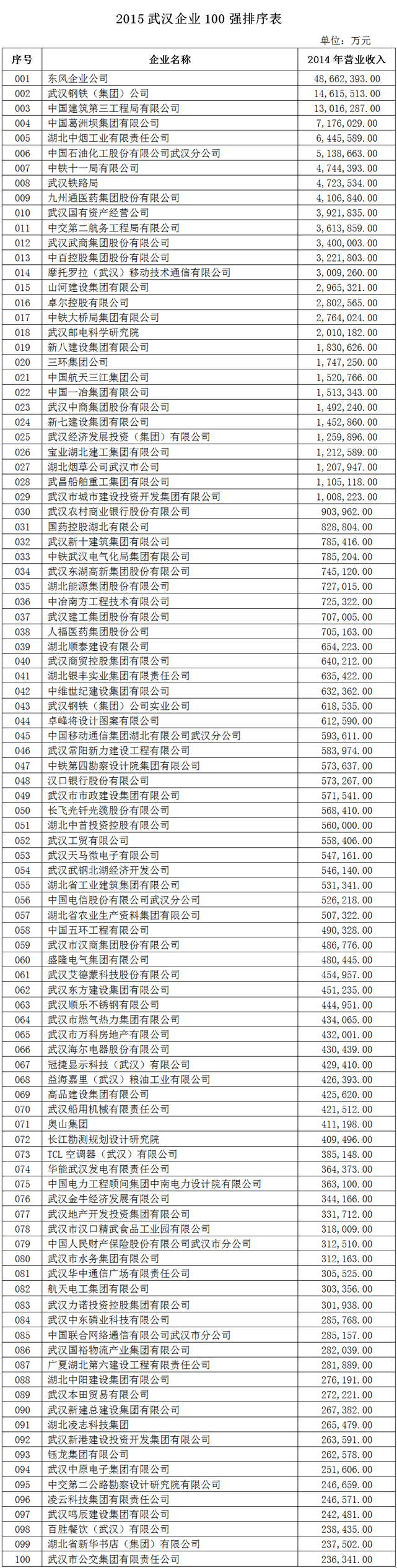 10月23日,2015武漢企業100強、武漢名營企業100強發布暨第十六屆武漢市優秀企業和優秀企業家表彰大會在武漢國際會展中心隆重舉行。根據《關于發布2015武漢企業100強的決定》(武企聯[2015]16號),集團公司再次躋身武漢百強企業,以126億元的營業收入名列第25位,比去年提升了6位。這是集團公司2010年以來連續第6次入圍武漢企業100強。