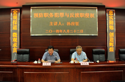 ??? 8月22日上午,在集團公司22樓多功能會議室,由集團公司黨委書記、董事長馬小援主持專題講座,特別邀請武漢市人民檢察院檢察長孫應征作了題為“預防職務犯罪與反瀆職侵權”講座。集團公司全體領導、各全資控股公司領導班子成員、集團本部員工100余人參加聽課學習活動。??