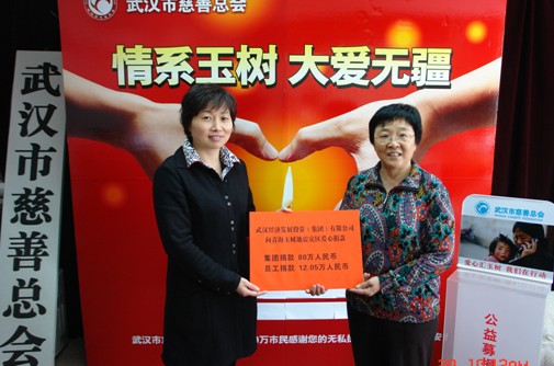 2010年4月29日上午,受集團公司黨委書記、董事長馬小援同志委托,集團公司黨委副書記、工會主席王晨冰同志將上述捐款92萬多元捐贈給武漢市慈善總會,為玉樹地震災區人民奉獻一片愛心。